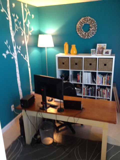 The first one I attacked was my office. Since I’m a serious fiction writer and all (ahem… please don’t chuckle), the Major let me have the “real” office. And I immediately decorated it exactly the way I wanted it… Girly colors and birch tree decals and generally just a kickass feminine creative space. What do you think?